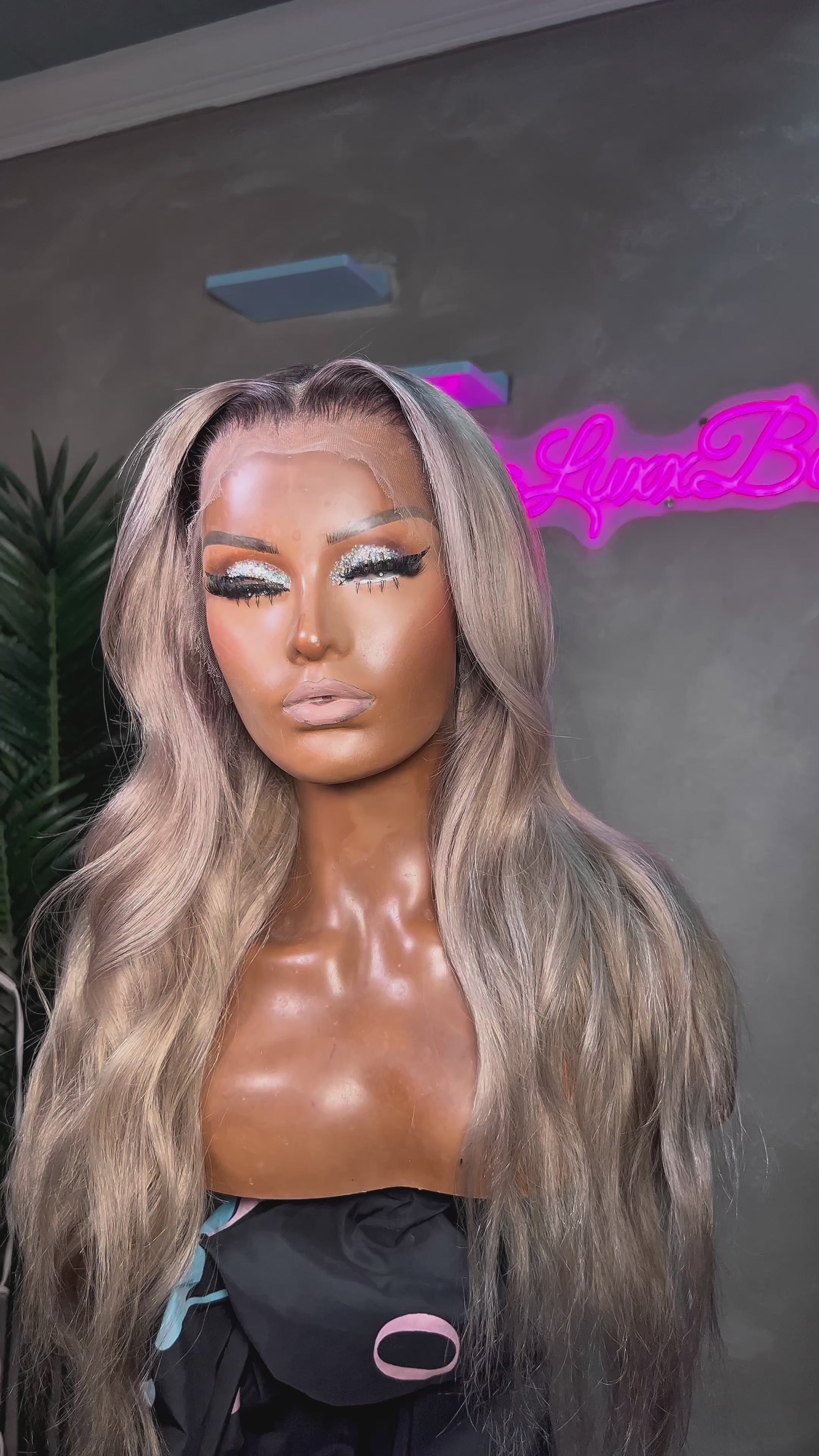 22 inch HD 13x4 blonde body wave frontal wig 180% density with custom beige blonde toning with smokey brown roots and lowlights