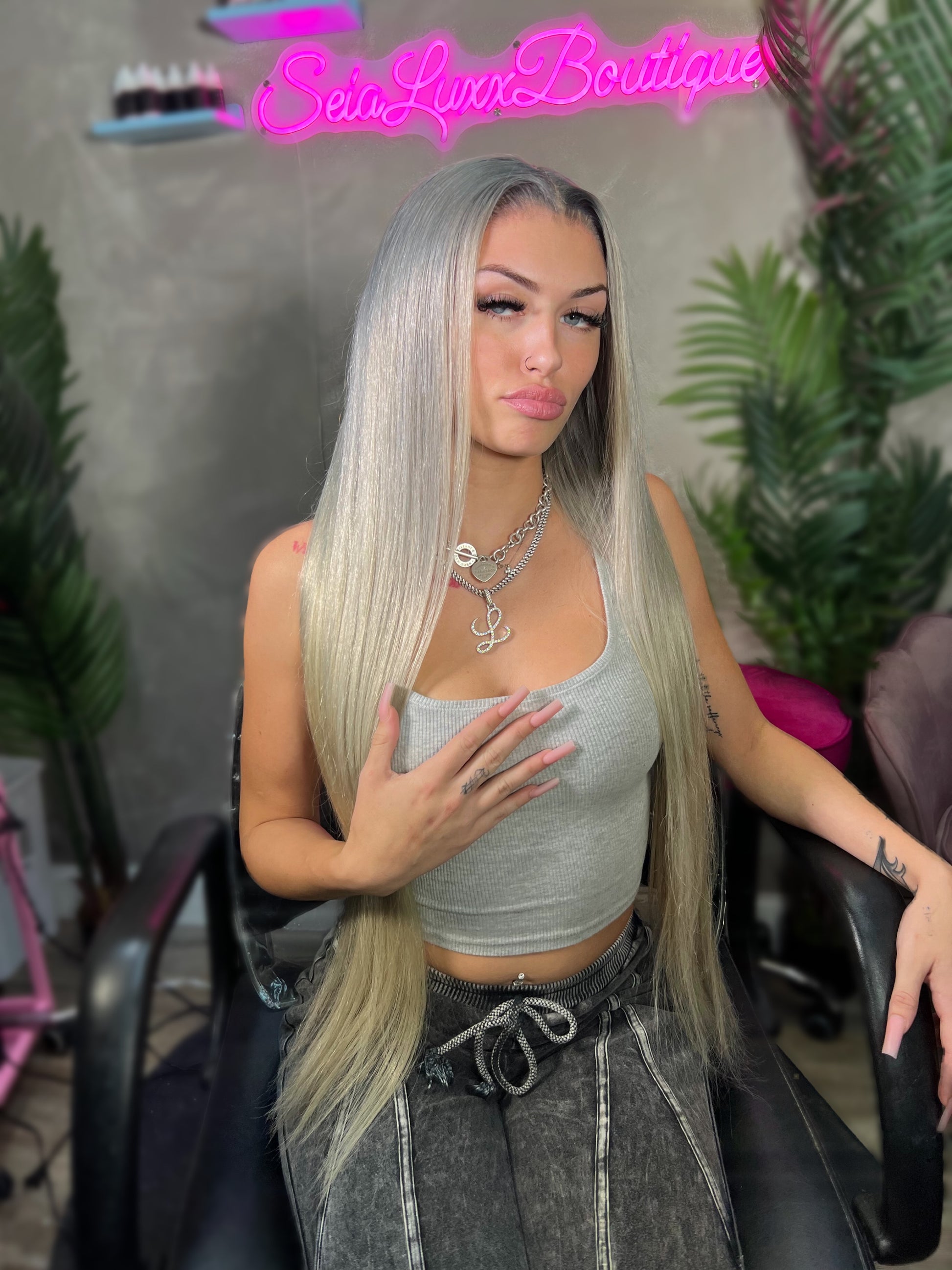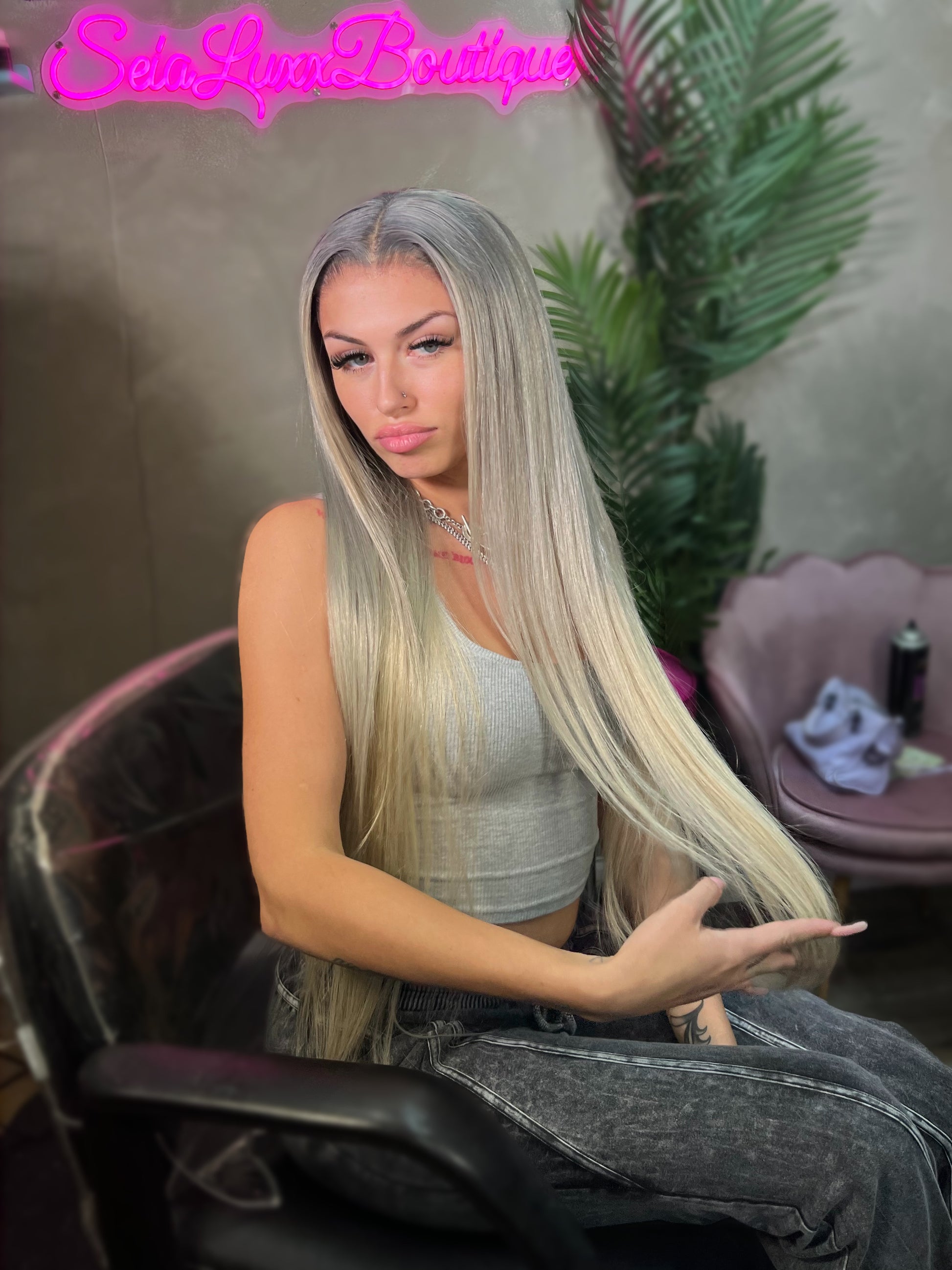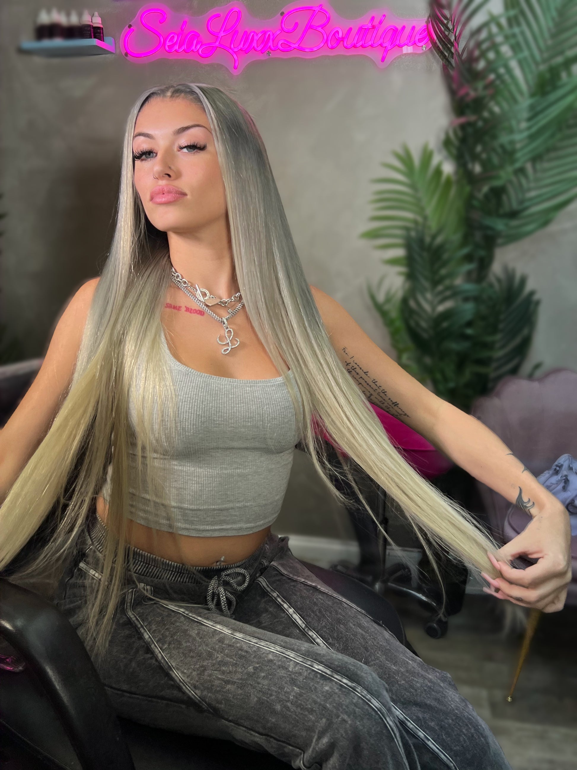 color customization - ash Violet shadow root with pale ash blonde money piece and ombre bottom