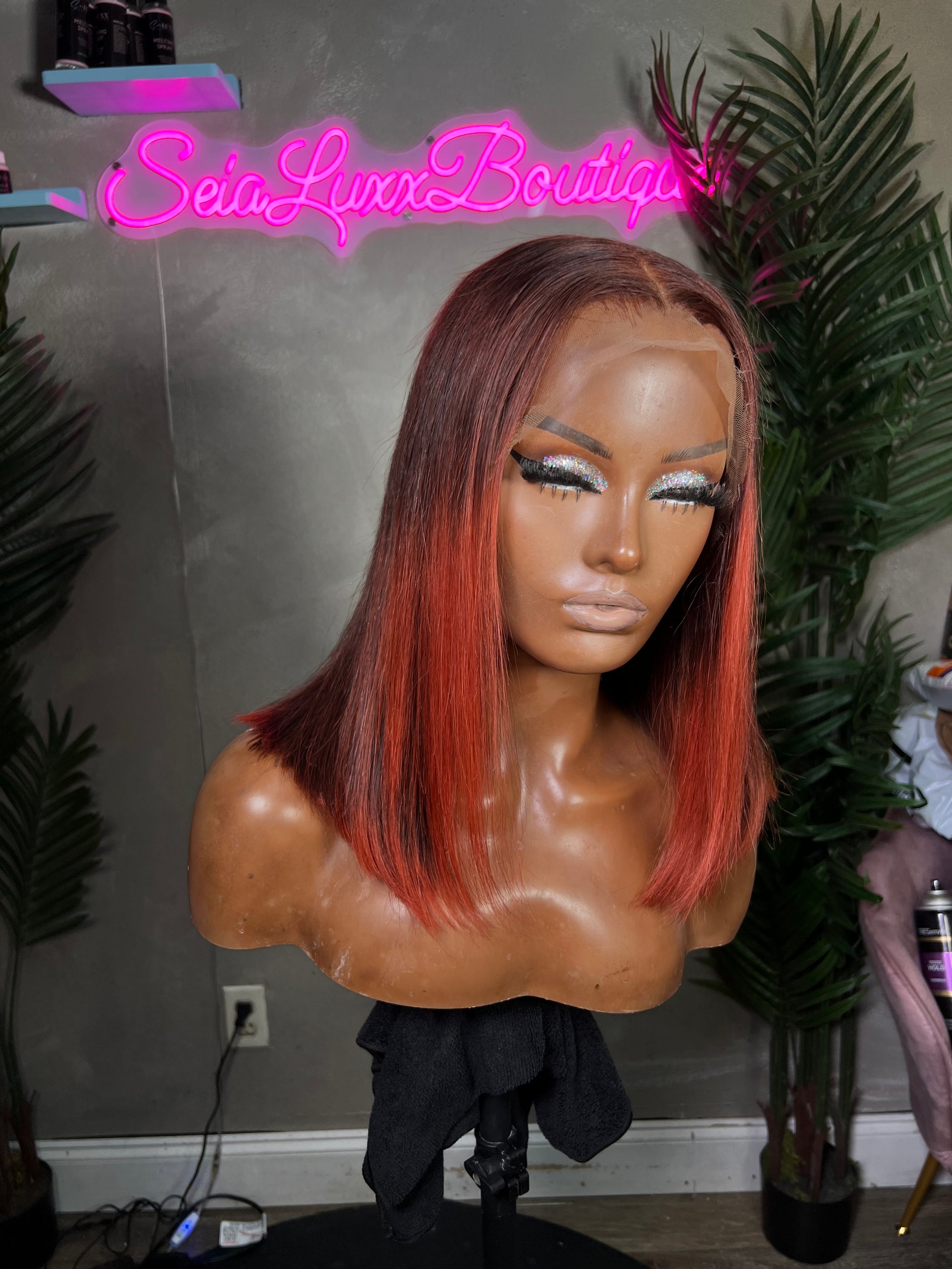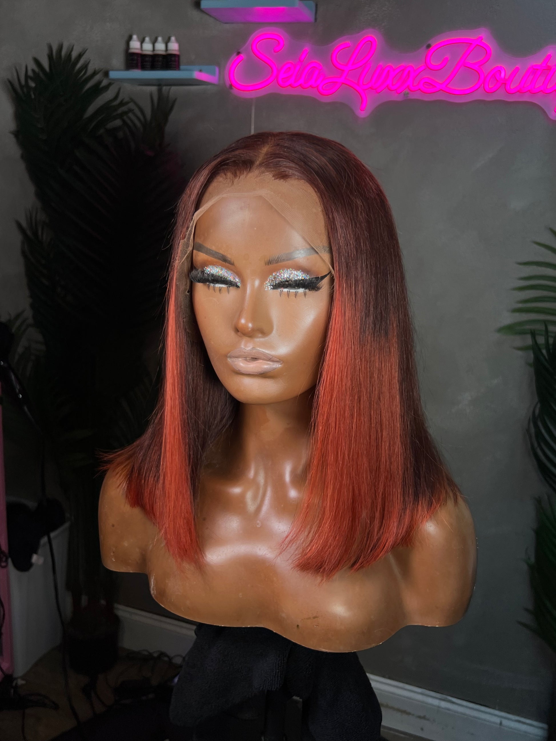 color customization - burnt copper/ auburn brown coloring all over With the ginger tips/highlights patch styled into middle part straight Bob