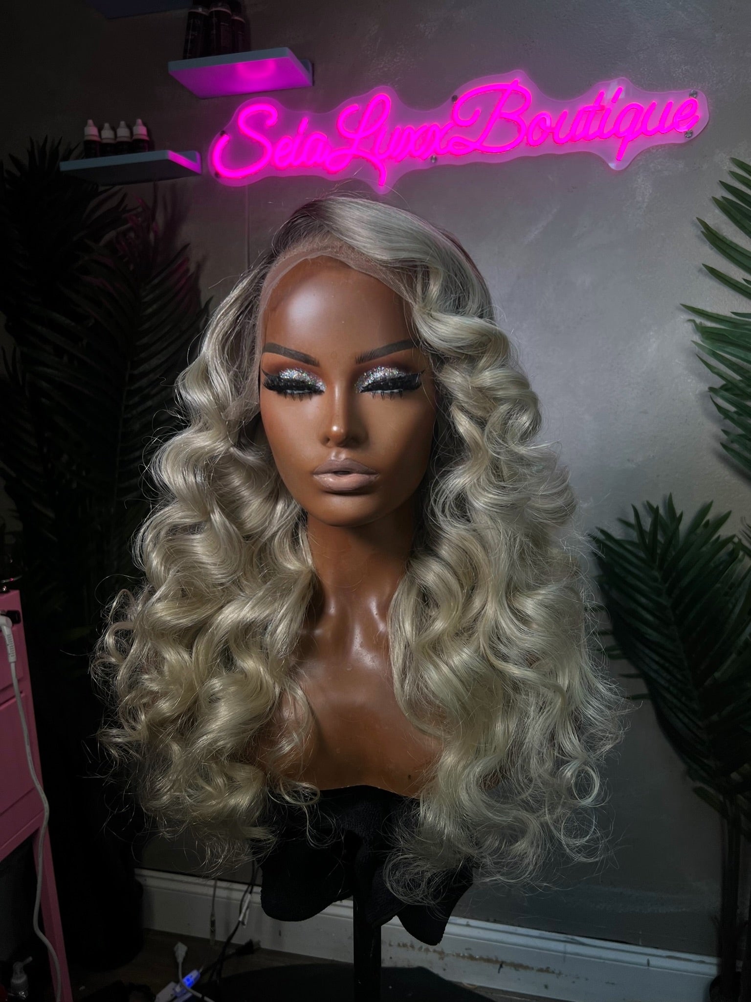 color customization - Creamy icy, blonde all over with smoking ash brown, low lights and shadow root With subtle blonde curls
